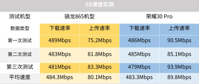 实测数据如下,荣耀30 Pro三次平均下载速率为483.3Mbps,骁龙865机型为484.3Mbps。而平均上传速率方面,荣耀30 Pro平均上传速率为89.9Mbps,骁龙865机型为80.1Mbps。两者在下载速率基本持平,上传速率方面麒麟芯片更有优势。