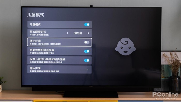 AI KIDS模式可以算得上是家长福利,不用随时盯着孩子了,AI慧眼通过特有瞳距识别技术,智能识别儿童,并通过距离和姿势检测技术,捕捉儿童的距离及姿势进行自动提醒。