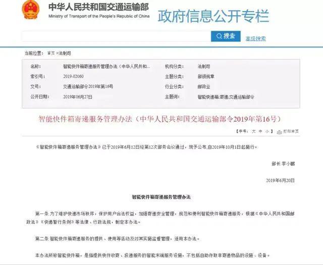 早在2019年6月20日,交通运输部公布了《智能快件箱寄递服务管理办法》,自2019年10月1日起施行。其中规定,快递员使用智能快件箱投递快件,应征得收件人同意。投递快件后应及时通知收件人。