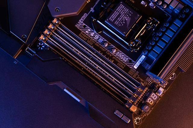 Z490 AORUS XTREME除了为第十代酷睿极限超频做好了万全的准备外,在内存超频方面也是超级强悍,这主要是得益于采用了全新的SMT内存插槽,背面没有金属针脚露出,大大减小了受到的干扰,同时内存布线也在PCB保护层下方,外加接地层提升了抗干扰能力,而内存电路中的钽电容则位于内存插槽PCB正对的背面,可以提供更佳的高频响应速度。所以,在开启XMP模式的情况下,Z490 AORUS XTREME可以轻松支持DDR4 5000+超高频率内存,这在很多游戏中都能带来巨大的帧速提升。