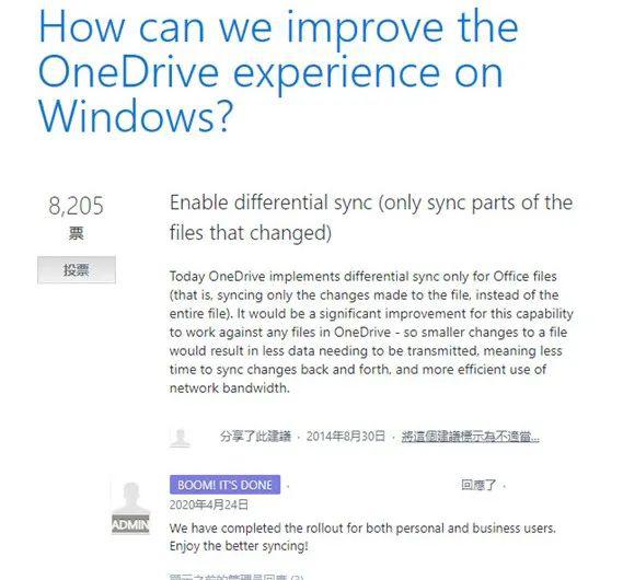 6年前有人给微软提议OneDrive改善增量同步功能,现在微软终于搞定了。对普通人来说,增量备份/上传这个问题影响不大,但是对办公、企业用户来说,增量备份是个必备功能,OneDrive网盘本身就是定位于生产力方向的,没有增量备份是不行的。
