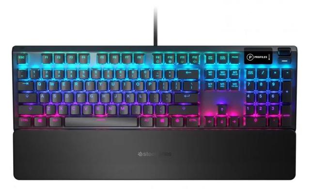 按键表面覆盖有类肤涂层,触感细腻,且布局符合人体工学设计,配上硅胶表面腕托,手感舒适。APEX 5采用的是Hybrid Mechanical RGB Switch轴体,结合了Cherry MX红轴的轻巧手感与Cherry MX青轴较强段落感的双重优势,游戏、打字两相宜。另外这款键盘还具有免驱调节功能,通过长按多媒体按键即可进行设置菜单,实现对配置文件、调节键盘背光、添加、删除宏指令等的调节,设置起来就简单多了。