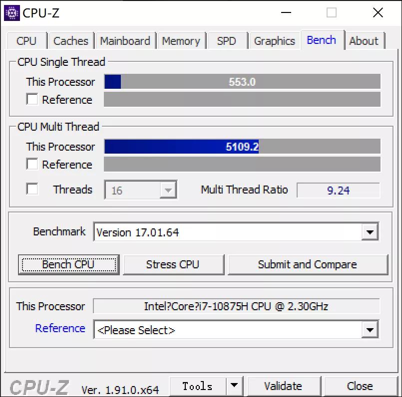 ▲CPU-Z的基准测试,多核分数5109.2,单核分数553,轻松超过第九代i7 9750H 的3500/500左右的得分。其中多核成绩提升幅度约为46%。