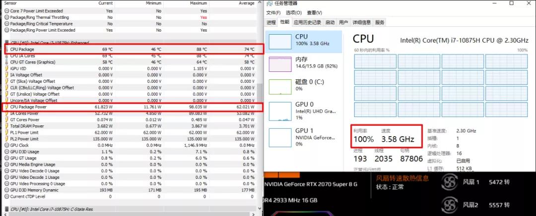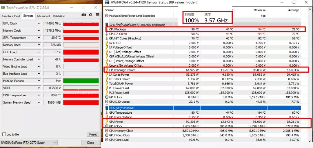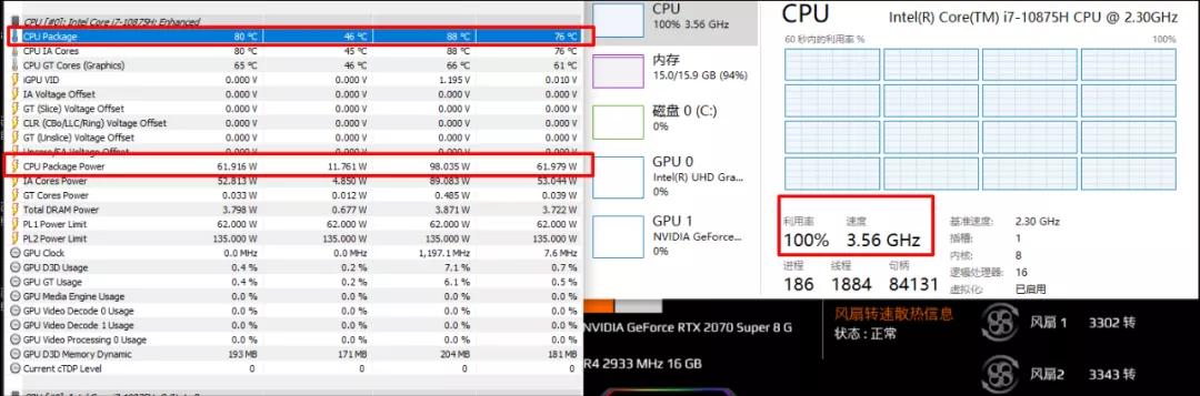 CPU封装功耗约为62W,最高温度为94℃,保持在90℃左右,频率则维持在3.5GHz上;GPU功耗处于90W,频率在1440MHz左右,温度80℃。从双考来看,技嘉新AERO 17 双核心高负载无压力。可以搞定CPU 62W/3.5GHz+GPU 90W/1440MHz的组合。