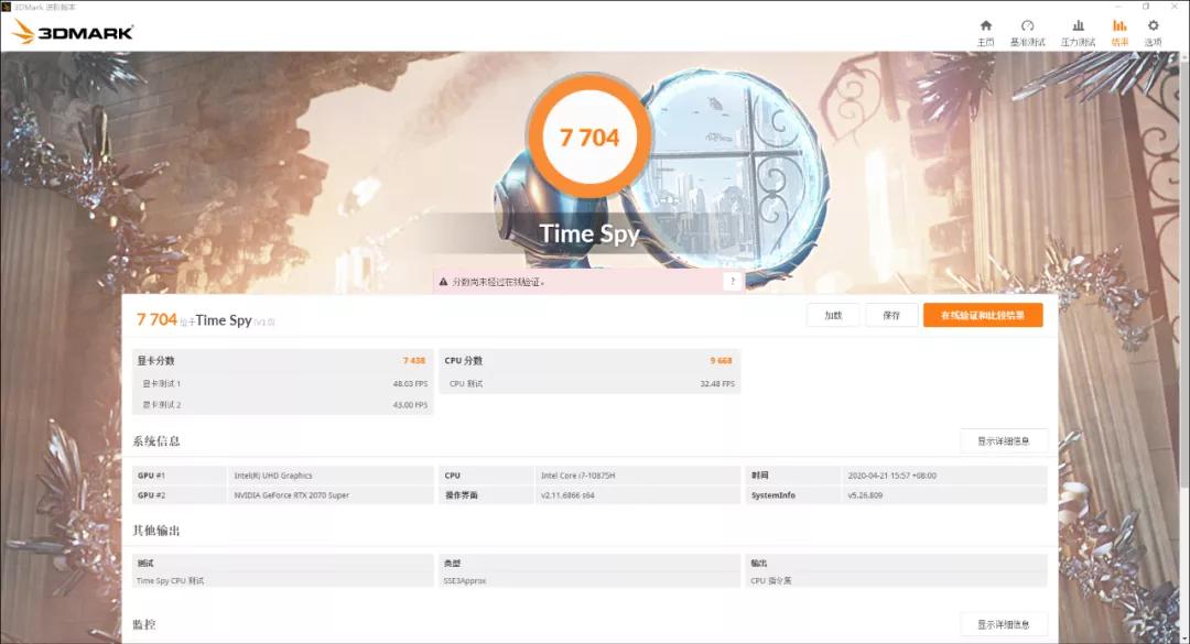 从上面3DMark的显卡基准性能测试来看,90W状态下的RTX 2070 SUPER Max-Q 8GB+i7 10875H组合,其显卡基准测试中略微超过了115W老款RTX 2070 8GB+i7 9750H的组合。接下来再看看另外三个基准测试。