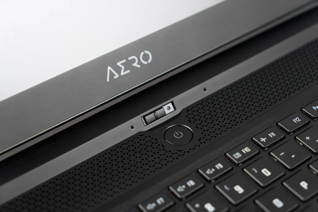 ▲AERO 17的电源按键换成了圆形按钮(AERO 15是矩形按钮),摄像头依然在在电源按键前方,并带有物理挡板。当然,这个设计见仁见智,从外观视觉效果来说,无疑是成功的,可以做到三面超窄边框,看起来的确很漂亮。而如果需要用到摄像头,就略有“鼻孔摄像头”的尴尬。