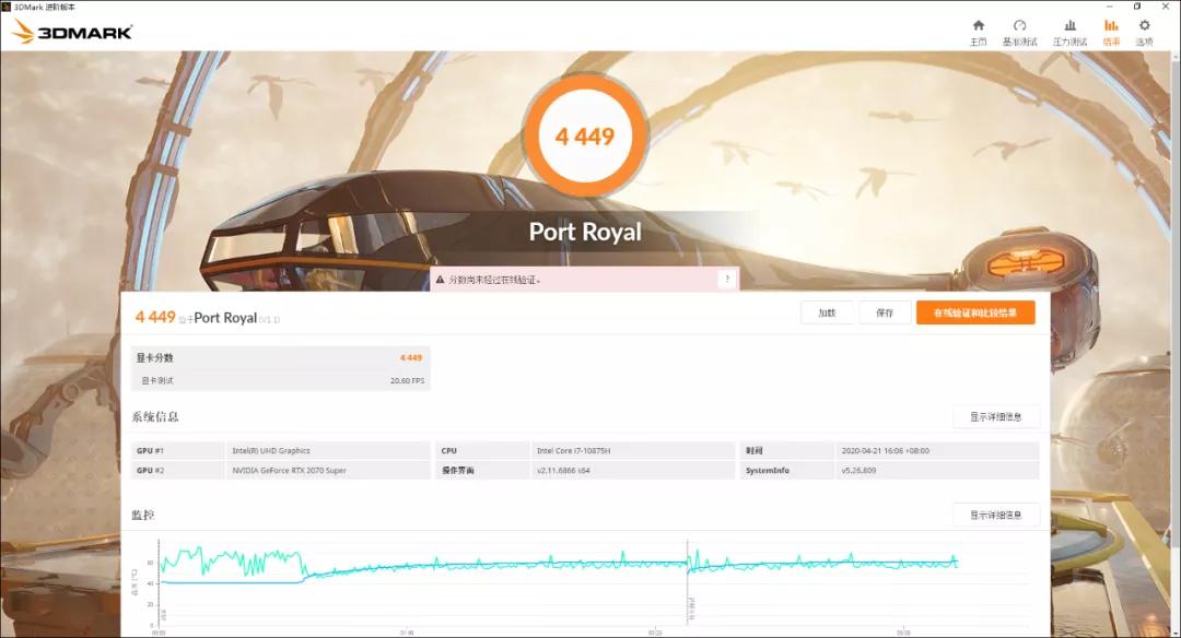 ▲3DMark Port Royal光线追踪测试,成绩为4449分,相应的,RTX 2070 8GB老款在4000分出头。