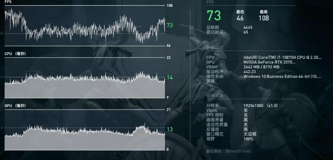▲《刺客信条:奥德赛》,FHD预设高画质,技嘉AERO 17平均帧速为73,老款RTX 2070 8GB的平均帧速是66fps。