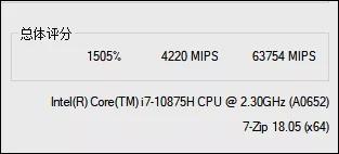 ▲7-ZIP的基准测试,CPU成绩为63754MIPS,上一代i7 9750H为46060MIPS,提升幅度约为38.4%。