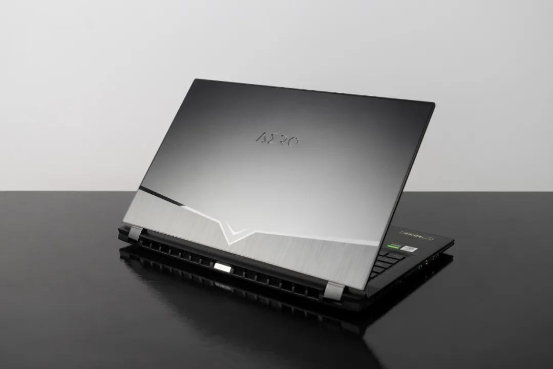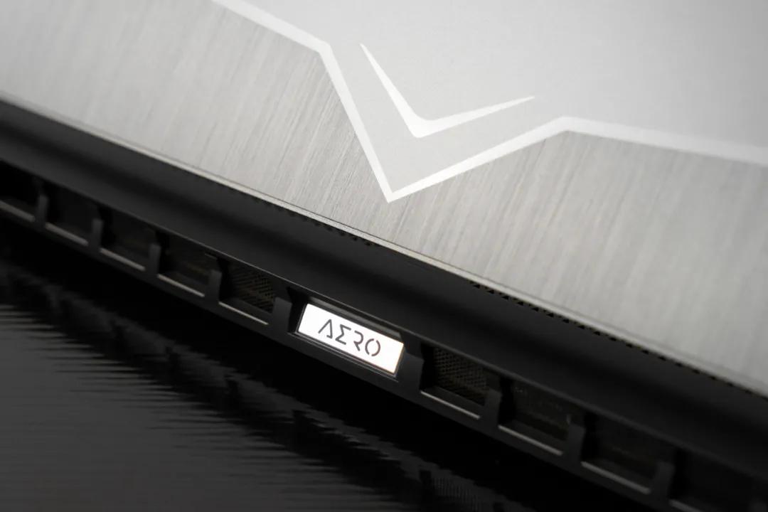 在细节方面,技嘉新AERO系列高性能本具有家族式设计风格,不管是15.6英寸版,还是17.3英寸版,A面都是两段式切割造型:上半部分为磨砂工艺,并镶嵌有技嘉的AERO字母LOGO——开机即可发光,既提升了整机档次感,也彰显了个性。下半部分则是金属拉丝工艺,中间衔接的是一条“v”型的镜面线条。C面最前方设计了方便开盖的沟槽,让它可以单手开合屏幕,这个小细节也是很考究配重设计功底的。
