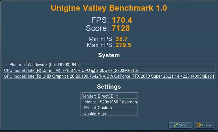 ▲Unigine Valley Benchmark是比较准确的3D性能基准测试,FHD高特效平均帧速170.4fps。作为参考,115W老款RTX 2070 8GB是145.6fps。