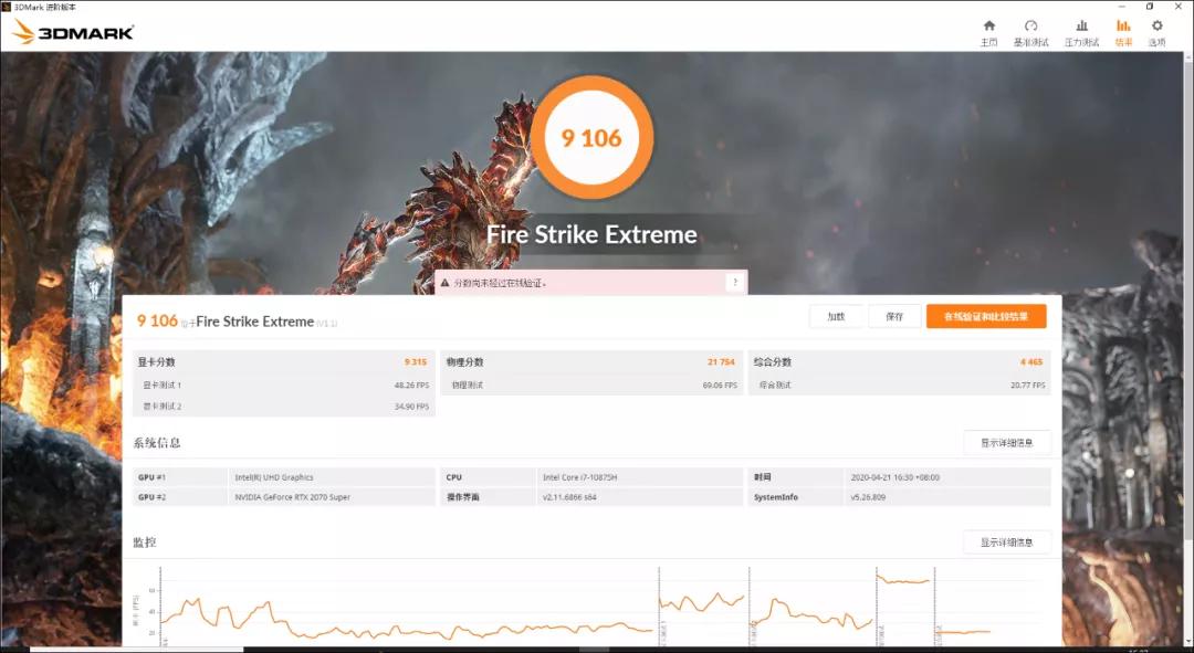 ▲2K分辨率Fire Strike Extreme场景得分9106,RTX 2070 8GB老款成绩是9000分左右。