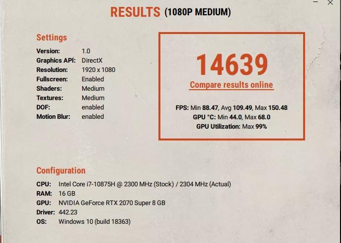 ▲最终幻想15的Benchmark,默认FHD标准画质,10359分。稍微领先于115W老款RTX 2070 8GB的10348分。