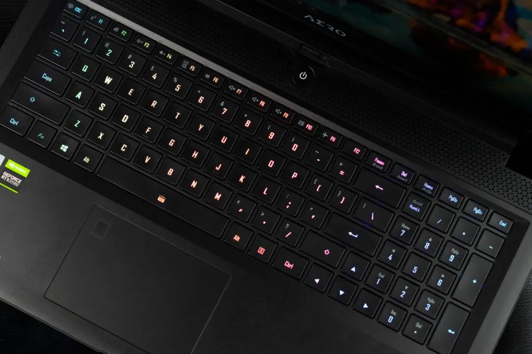 ▲键盘设计细节,也是家族式的小方格键帽,键程中等,打字体验还不错,并有一定的间距。数字小键盘、全尺寸光标键都有。AERO系列机型的键盘支持1677万色RGB背光,键帽的透光性很好,亮度高且鲜艳,可以设置成各种炫酷的灯效,想沉稳一些就可以设置成纯白色背光,想活跃一些可以设置成单键RGB,再来个跑马灯/呼吸/闪亮效果,可玩性很足。触控板操控精准,带有指纹识别。