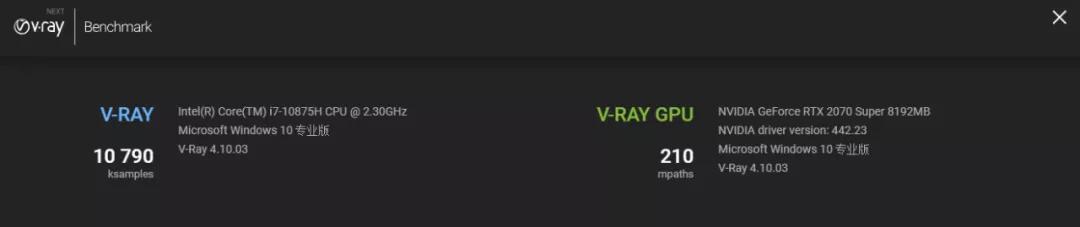 ▲V-ray渲染测试,CPU成绩为10790,上一代持续运行85W的六核i7 9750H的成绩为8992,提升幅度约为20%。