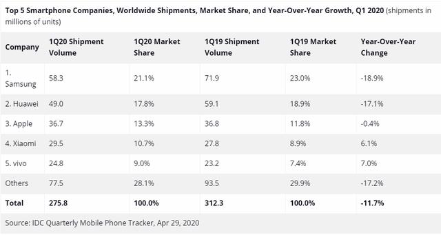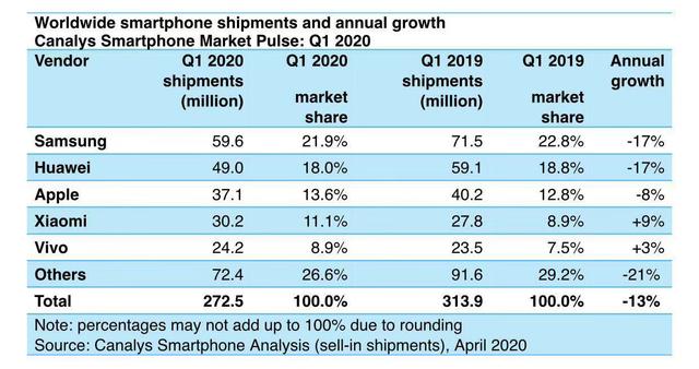 国际权威机构IDC最新报告显示,全球智能手机出货量在2020年第一季度同比下降11.7%。其中,三星、华为、苹果依旧稳居前三,分别为21.1%、17.8%和13.3%。