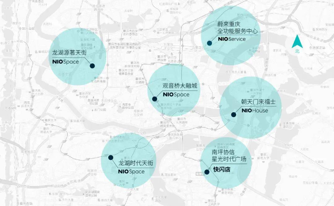 目前为止,在山城重庆已经布局5家门店,蔚来中心 | 重庆朝天门、蔚来全功能服务中心、蔚来空间 | 重庆时代天街、蔚来快闪店|重庆协信星光时代广场以及蔚来空间 | 重庆大融城。