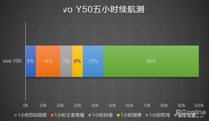 其实对于普通用户来说,在日常情况下很少会如此高强度时候手机的,不过即便如此,vivo Y50的最终还是能够剩余55%的电量,也就是还能继续坚持一轮五小时的续航测试。按照我们以往的经验来看,这样的成绩表现足以让这部手机轻松使用两天。