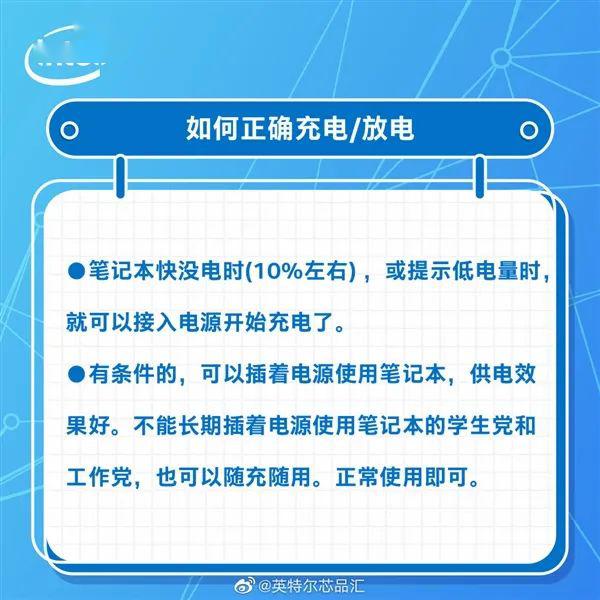 英特尔官方科普提到:当笔记本电池充满电之后,电脑会自动使用电源进行供电,而不是使用电池。当你使用电池很频繁,你可以将电池放电到比较低,大约10%-15%再充电。但如果是将放电到连机器都开不了(0-1%),这就会对锂电池造成较大的损伤(属于深度放电),长此以往会快速消耗电池寿命。