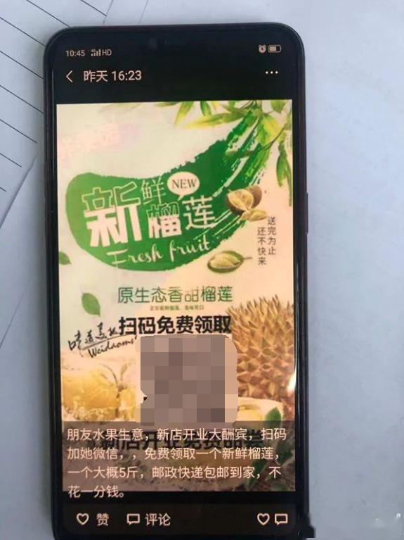 “扫一扫,免费领榴莲”,你的朋友圈里是否出现过这样的“自来水”广告。在这些广告中,有些确实是商家货真价实的优惠活动,有些则是不法分子暗藏的套路。近日,浙江慈溪公安侦破了一起电信网络诈骗案,犯罪嫌疑人就是以免费送榴莲为幌子诱骗受害人刷单。