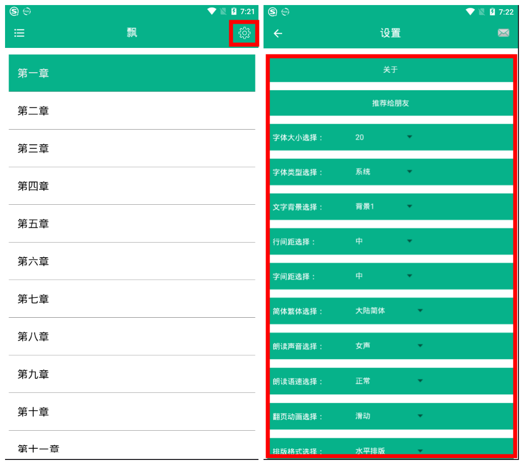 4、点击右上角的设置按钮,可以设置字体大小、背景等。