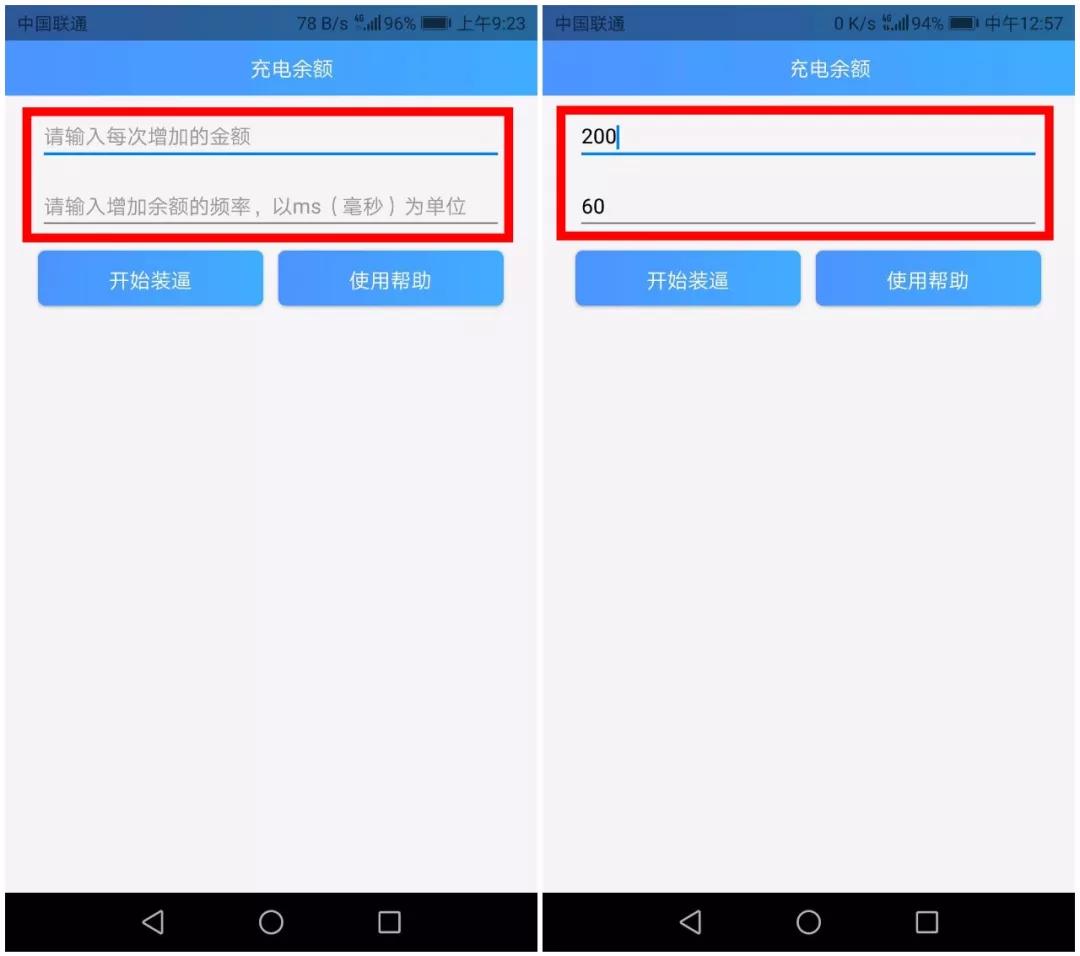 3、设置好后,点击“开始装”,接着给手机充上电,就可以看到余额不断增长啦(停止充电,余额暂停增长)