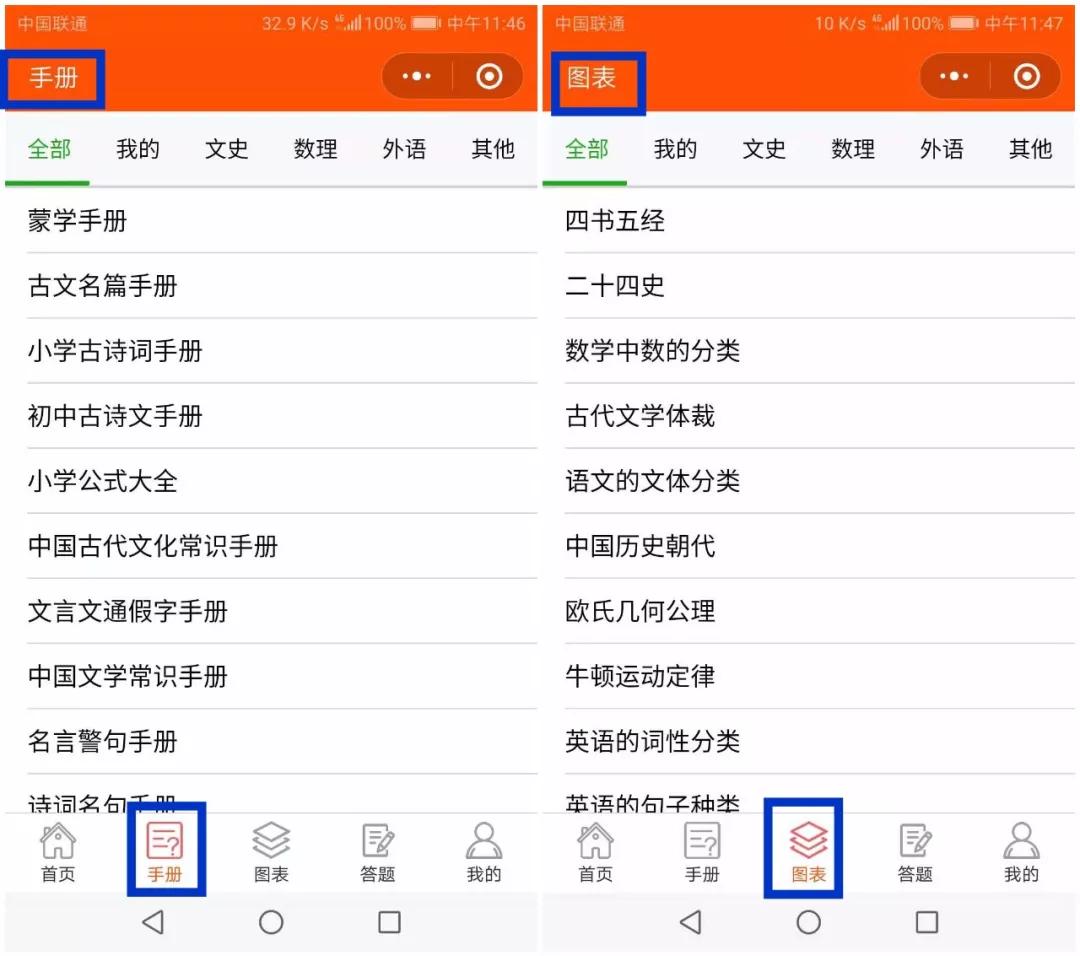 5、在下方还有“手册”、“图表”、“答题”等选项,都包含了丰富的知识,还可以测试自己的水平。