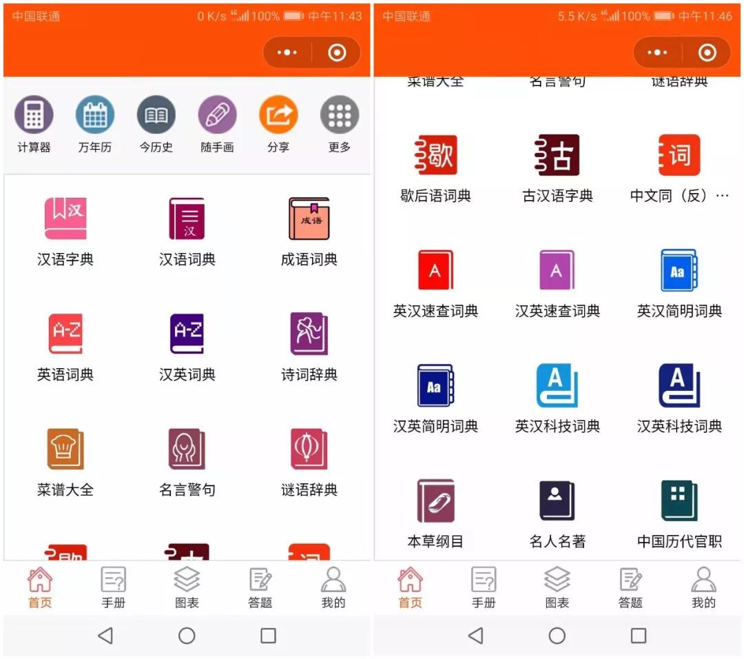 2、进入后可以看到小程序里包含了汉语字典、汉语词典、成语词典、英语词典、汉英词典、诗词辞典、名言警句、歇后语、名人名著等十多大类的词典。你想查什么都可以!