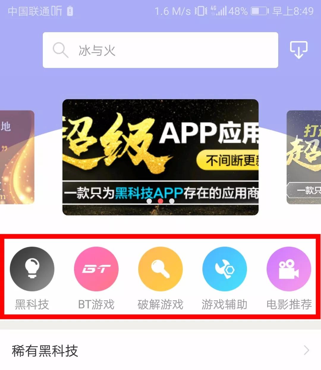2、进入后可以看到顶部有几大软件分类,分别是“黑科技”、“BT游戏”、“pj游戏”、“游戏辅助”和“电影推荐”等。底部有推荐的稀有黑科技软件。