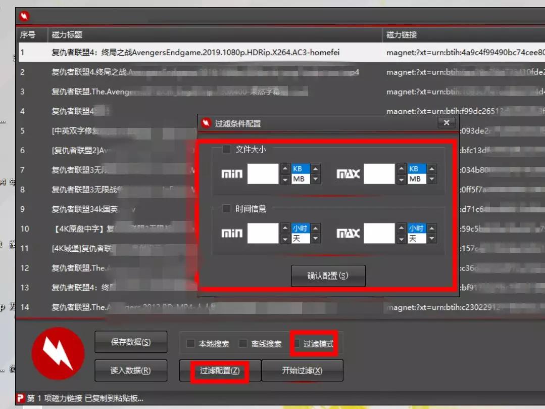 4、想要对搜索结果进行筛选过滤的话,勾选上“过滤模式”,可以按照大小和时间过滤。