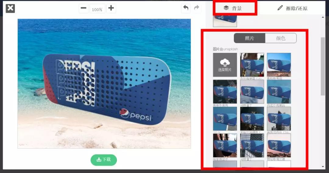 4、如果觉得细节不满意,或者想换背景,可以点击“编辑”,提供了各种背景,可以更换,也可以点击“擦除或者还原”,对细节部分进行精修。