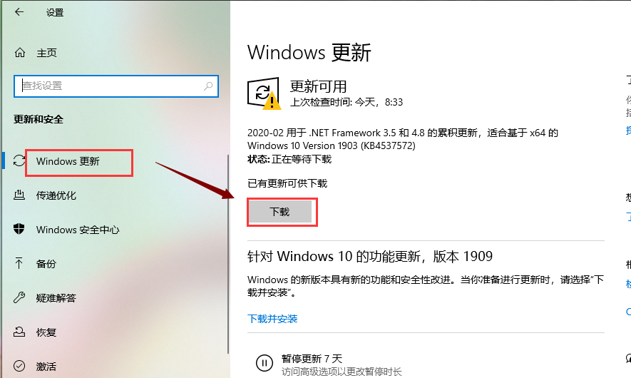 2,选择“Windows更新”,如果有补丁需要安装的话直接点击“下载”就可以了。