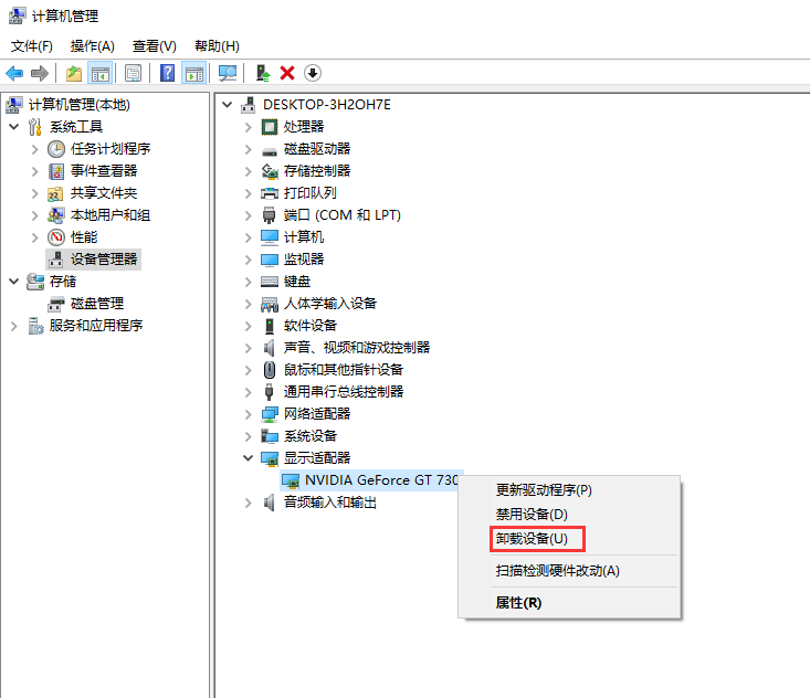 6,点击“设备管理器”,然后在界面右侧展开“显示适配器”,并右键点击显卡驱动程序菜单栏选择“卸载设备”。