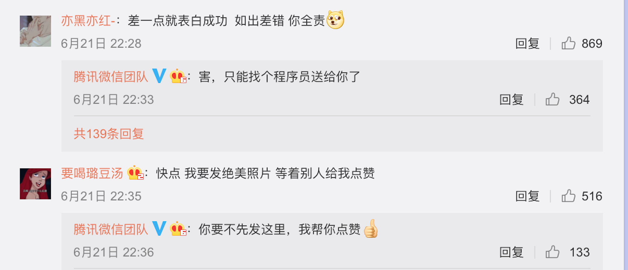 对于此次发生的事情,微信官方也在第一时间发布了公告。一些调皮的小伙伴留言表示:差一点就表白成功了,如有差错,你负全责。官方回复,只能找个程序员送给你了。俏皮的话语瞬间解决了这个尴尬的问题,这样的官方哪里找呀?