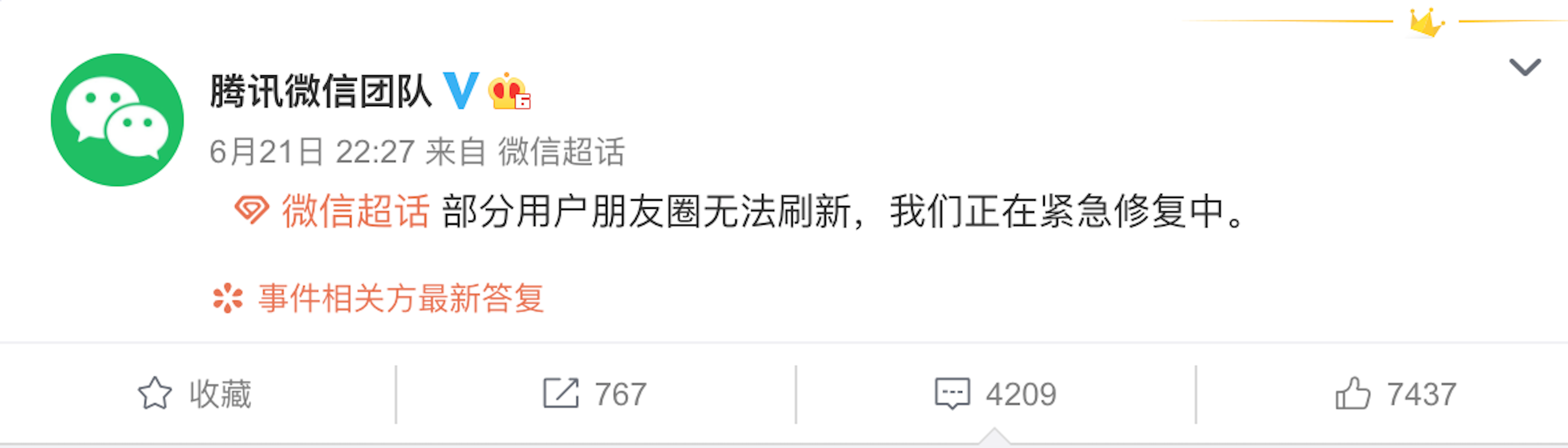 6月21日晚22时左右,微博、QQ空间被“朋友圈怎么刷新不出来了?”这件事给刷屏了,短短一个小时的时间,微信半夜突然崩了的消息迅速冲上了微博热搜榜,对于此事,微信官方也紧急做出了回应,正在紧急修复。23时30分左右恢复了正常。