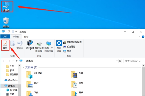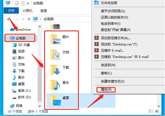 再打开“此电脑”找到“桌面”文件夹,然后右键点击选择“属性”,打开属性对话框;