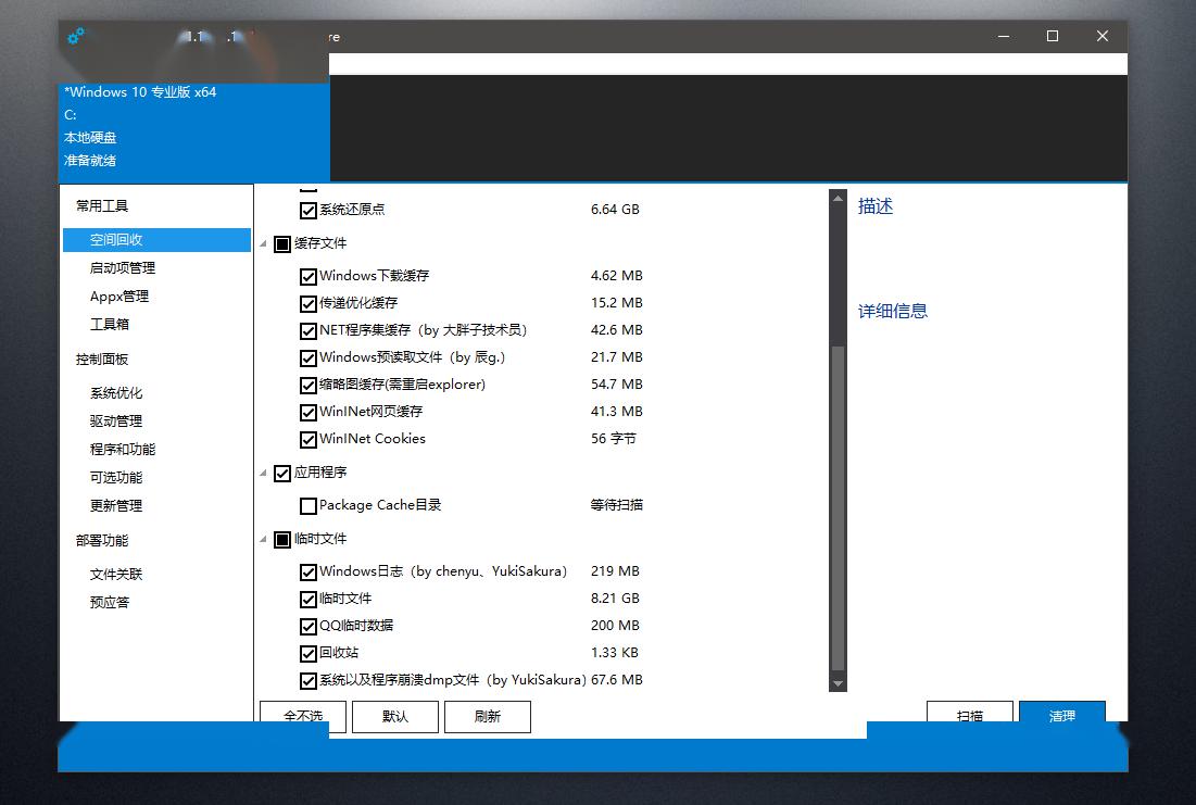 里面的空间回收就是清理垃圾的功能,细心的小伙伴一定能看到占用了8.21G硬盘空间的临时文件。