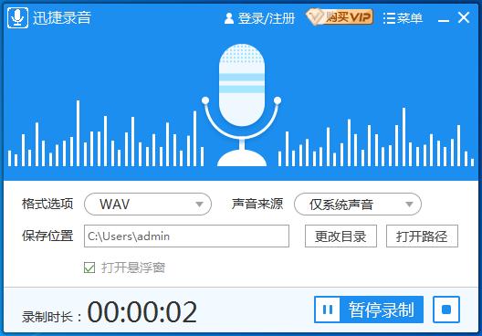 第一步:打开电脑上的迅捷录音软件后,我们进入主界面窗口,在上面可见“格式选项”、“声音来源”、“保存位置”、“打开悬浮窗”等一系列按钮。我们点击选择格式选项中的“wav”格式、声音来源中的“仅系统声音”,这样会大大减少出现杂音的情况。