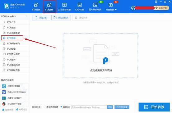 打开迅捷PDF转换器,在软件顶部找到PDF操作,然后在左侧的PDF的其他操作中,点击“PDF压缩。”