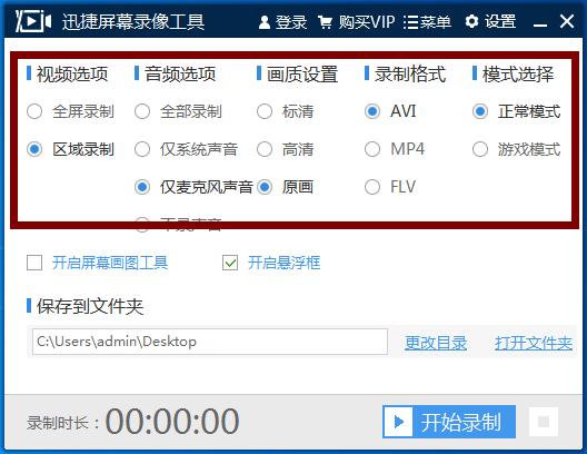 进入浏览器,搜索“迅捷屏幕录像工具”,找到官网,然后下载安装软件到电脑上。打开软件后,进入主界面窗口,对录制视频的区域(全屏录制和区域录制),录制的音频范围(全部录制、系统声音、麦克风声音和不录制声音),视频画质(标清、高清和原画),视频格式(AVI、MP4和FLV),录制视频模式(正常模式和游戏模式)依据个人需求,进行设置。