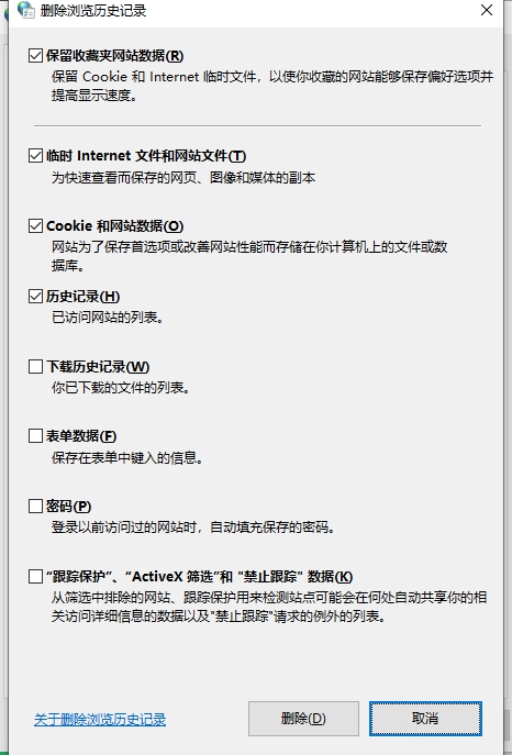 最后,在新弹出的删除浏览历史记录页中,将需要删除的选项勾选上。通常将前四个选项勾选上即可。勾选后点击最下方的“删除”按钮,浏览历史就顺利被删除了。