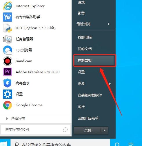 首先,点击桌面左下角的微软图标以打开系统菜单,选择“控制面板”并打开。