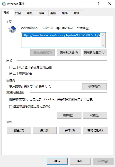 进入Internet属性页后,点击常规模块下方的“删除”按钮即可。
