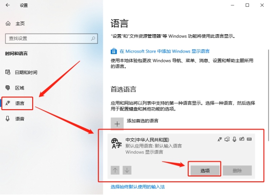 在左侧的菜单中切换至“语言”,再点击右侧“中文”,然后点击进入“选项”。