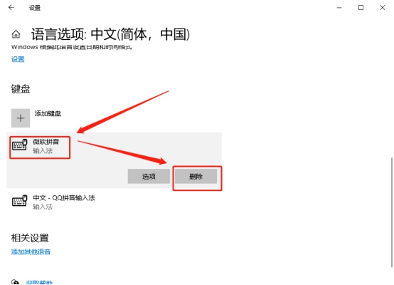 下拉到键盘处,点击“微软拼音”,再选择下方的“删除”即可,完成后我们的微软输入法就被删除啦。