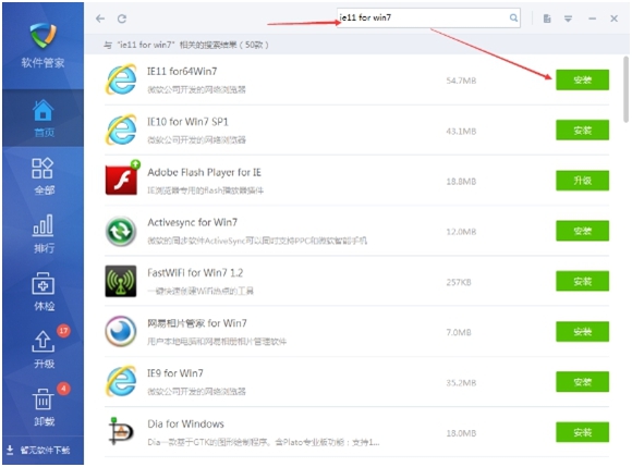 具体操作方法是打开金山毒霸进入下方的【软件管家】,在搜索框中进行搜索(Win7用户:搜索“ie11 for win7”)