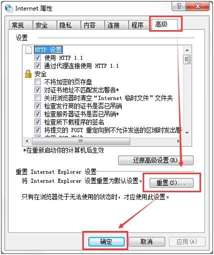 找到【高级】-【重置】,点击【重置】后再点击【确定】,然后重新打开IE浏览器测试是否恢复正常。