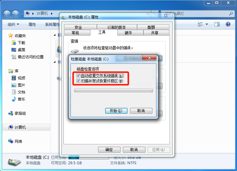 在C盘的属性页中选择“工具”,然后单击开始检查按钮。