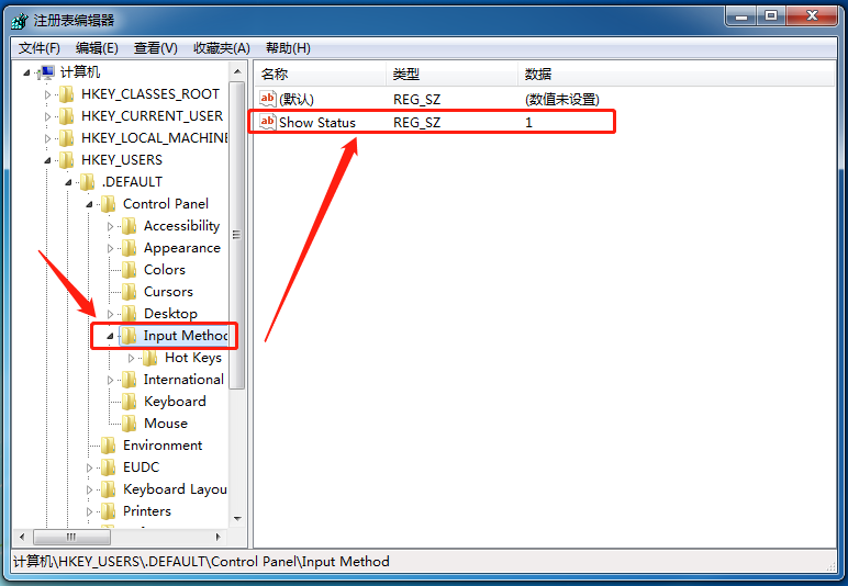 在注册表编辑器页左侧,依次点击打开文件夹“HKEY_USERS”—“DEFAULT”—“Control Panel”—“Input Method”,然后右键点击右侧窗口的“Show Status”,将数字修改为“1”再重启电脑即可。