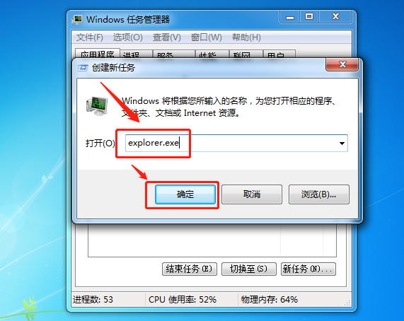 在“创建新任务”页面的输入框中输入“ explorer.exe”,最后单击“确定”。